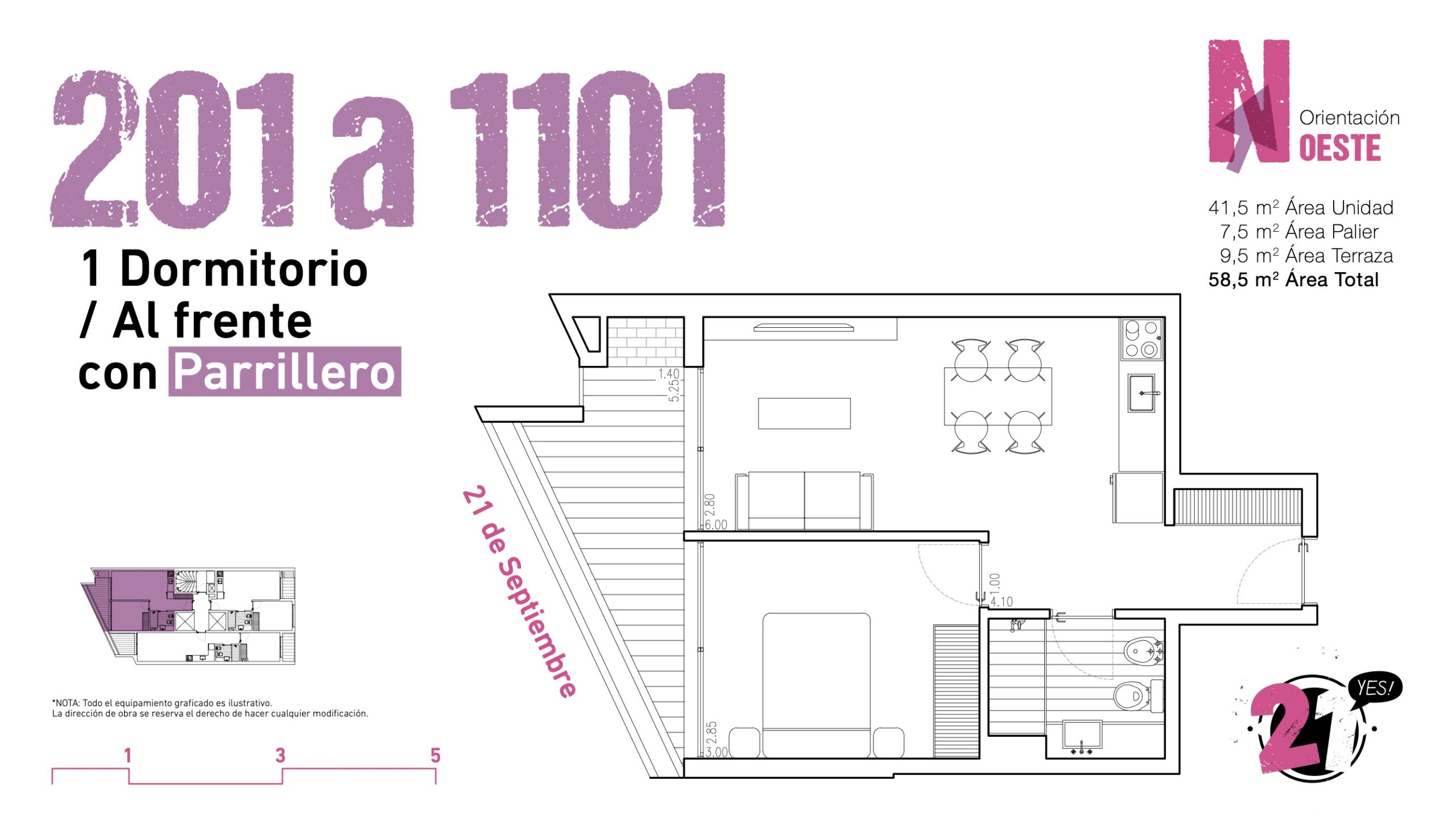 Respecto al diseño, la fachada con diseño contemporáneo propone canteros verdes que conectan visuales con el parque inmediato. La planta ofrece unidades detalladamente diseñadas con énfasis en los espacios exteriores y terminaciones. 21 YES! ofrece excelentes amenities como ser barbacoa cerrada con parrillero, gimnasio, lavadero y solárium en piso 13.