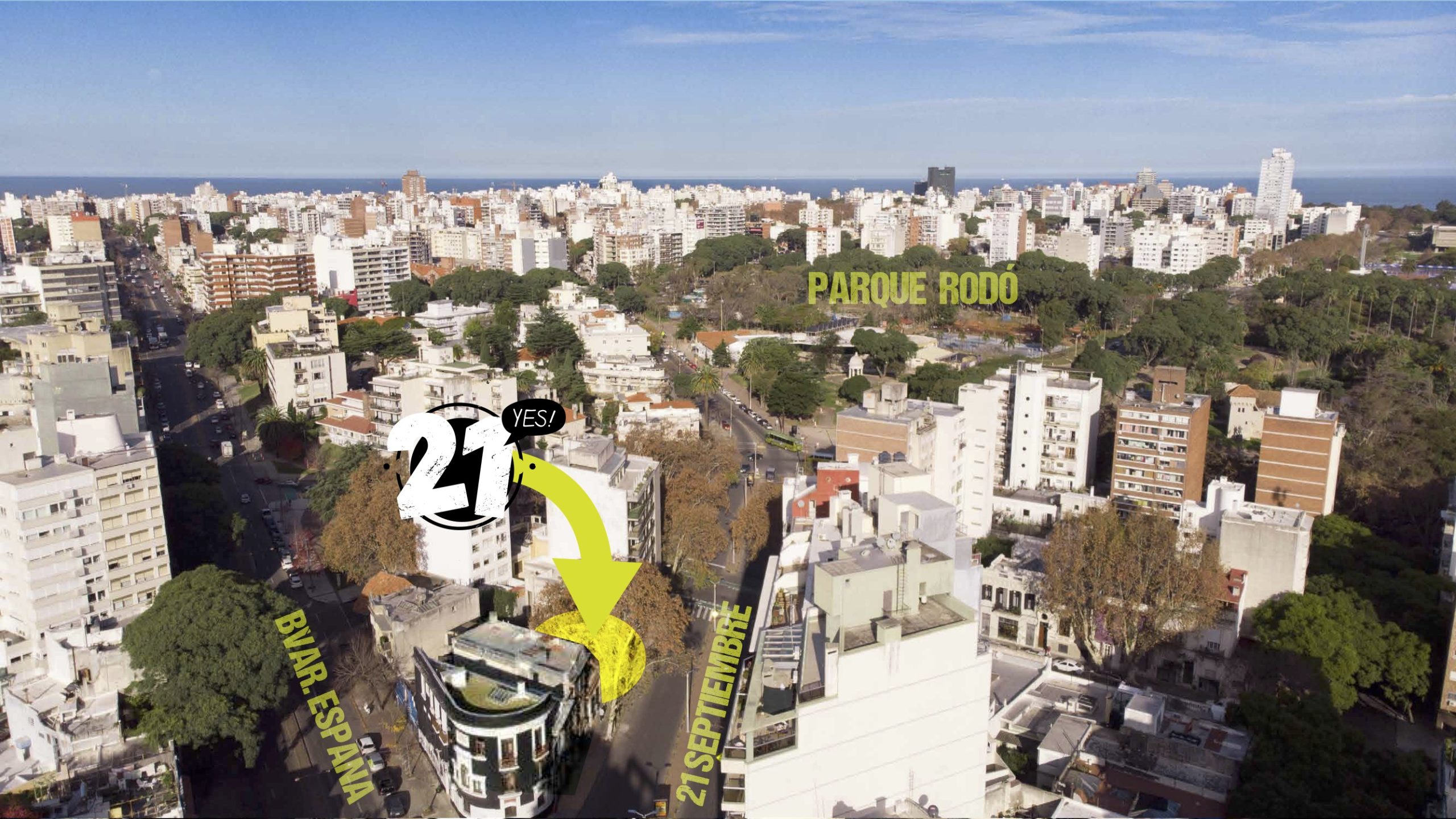 El edificio 21 YES! es un edificio de vivienda ubicado en el corazón de Montevideo a metros del Parque Rodó, tiene en un radio de 500m tres importantes universidades como Ciencias Económicas, Arquitectura e Ingeniería. Pensando en ese público es que entendemos el concepto YES como ideal para desarrollar un edificio que cuenta con un total de 34 apartamentos, 32 son de un dormitorio y 2 son mono ambientes.