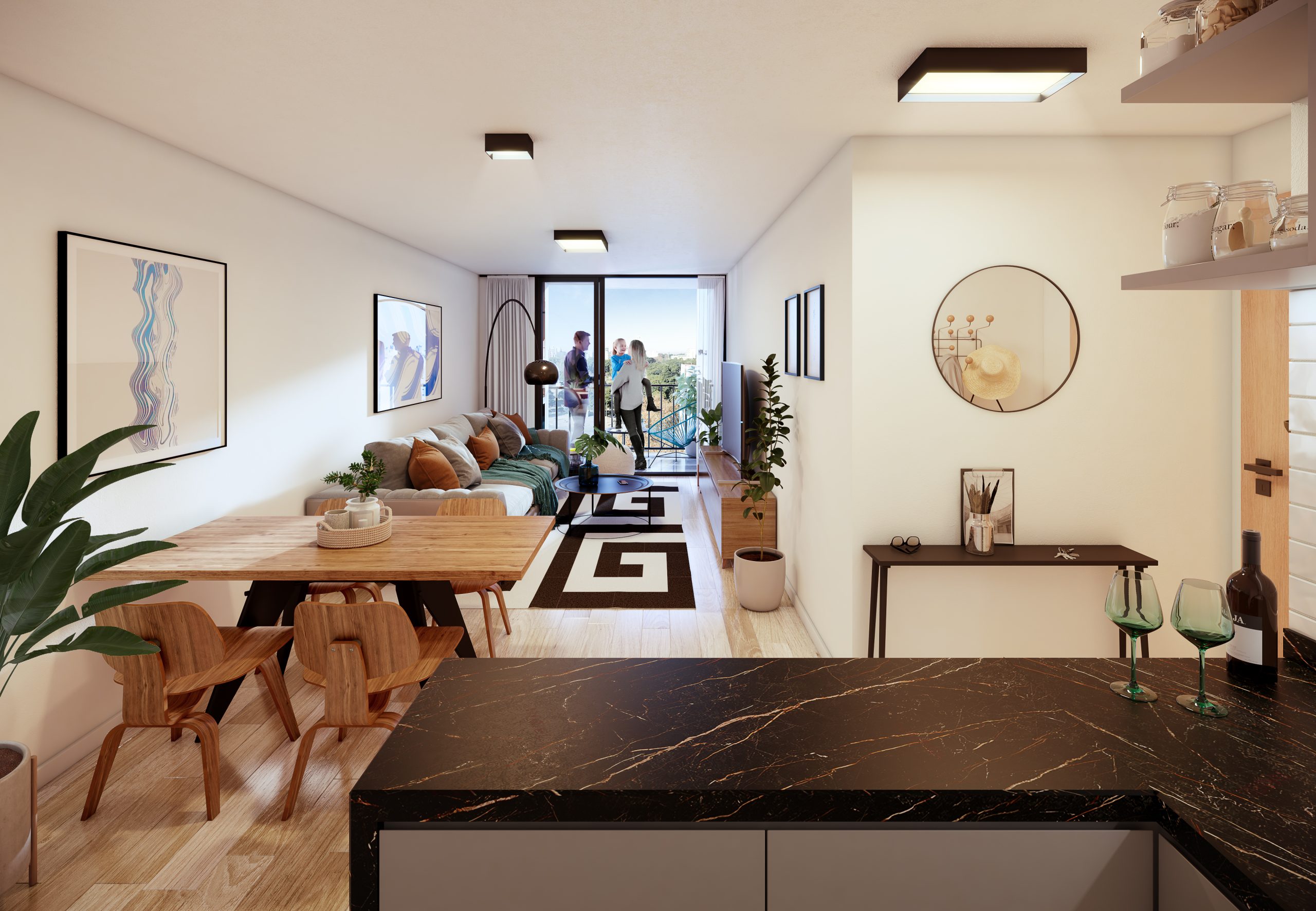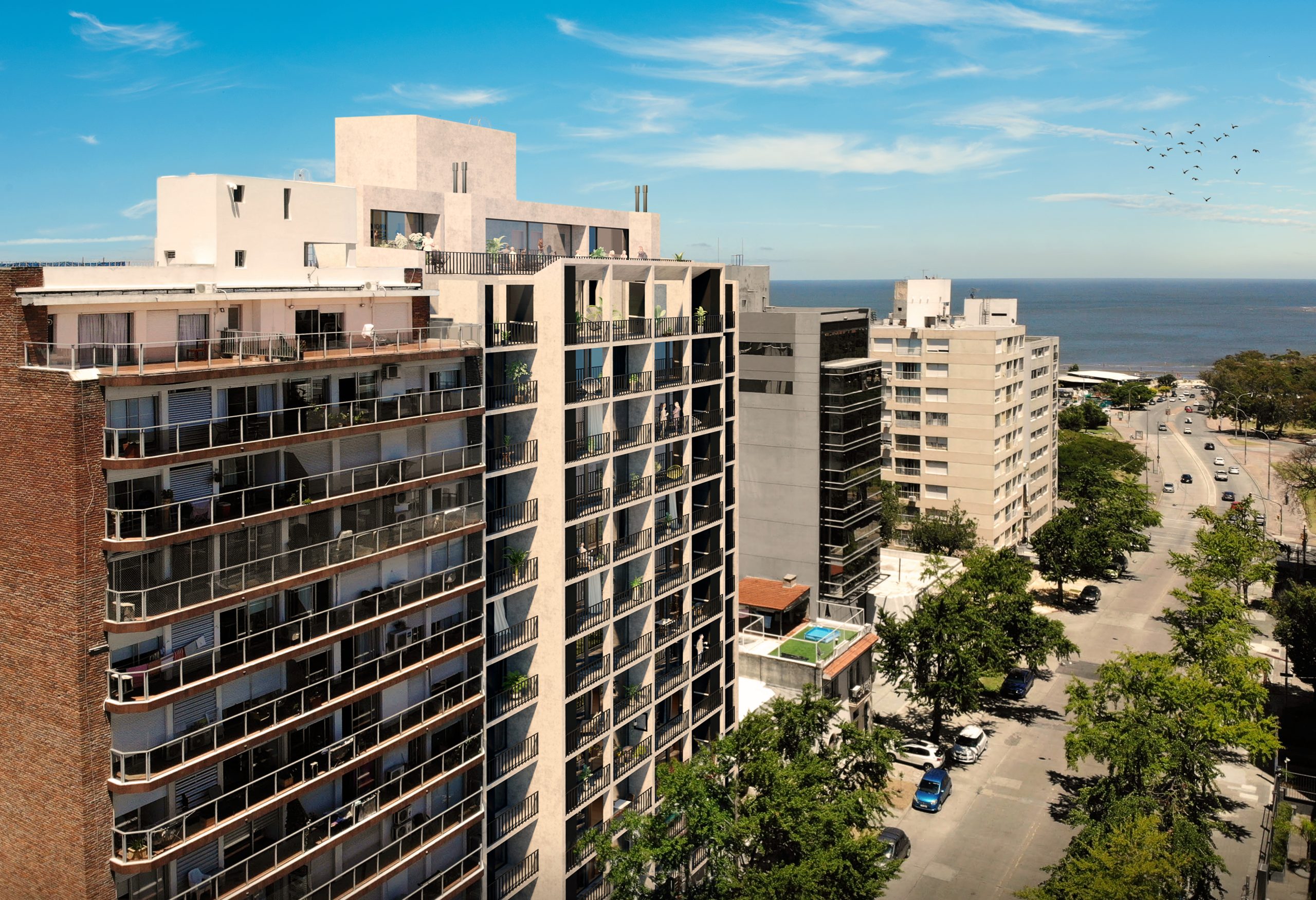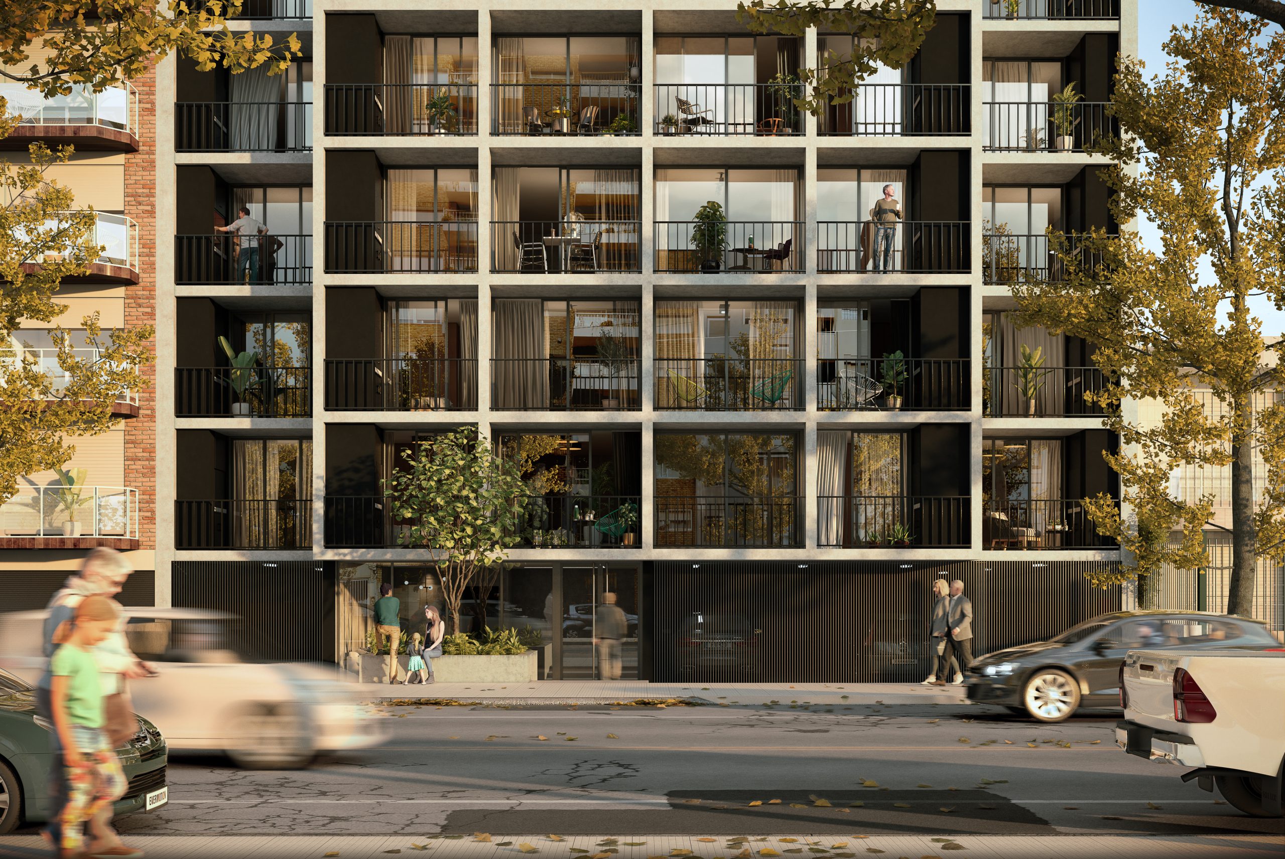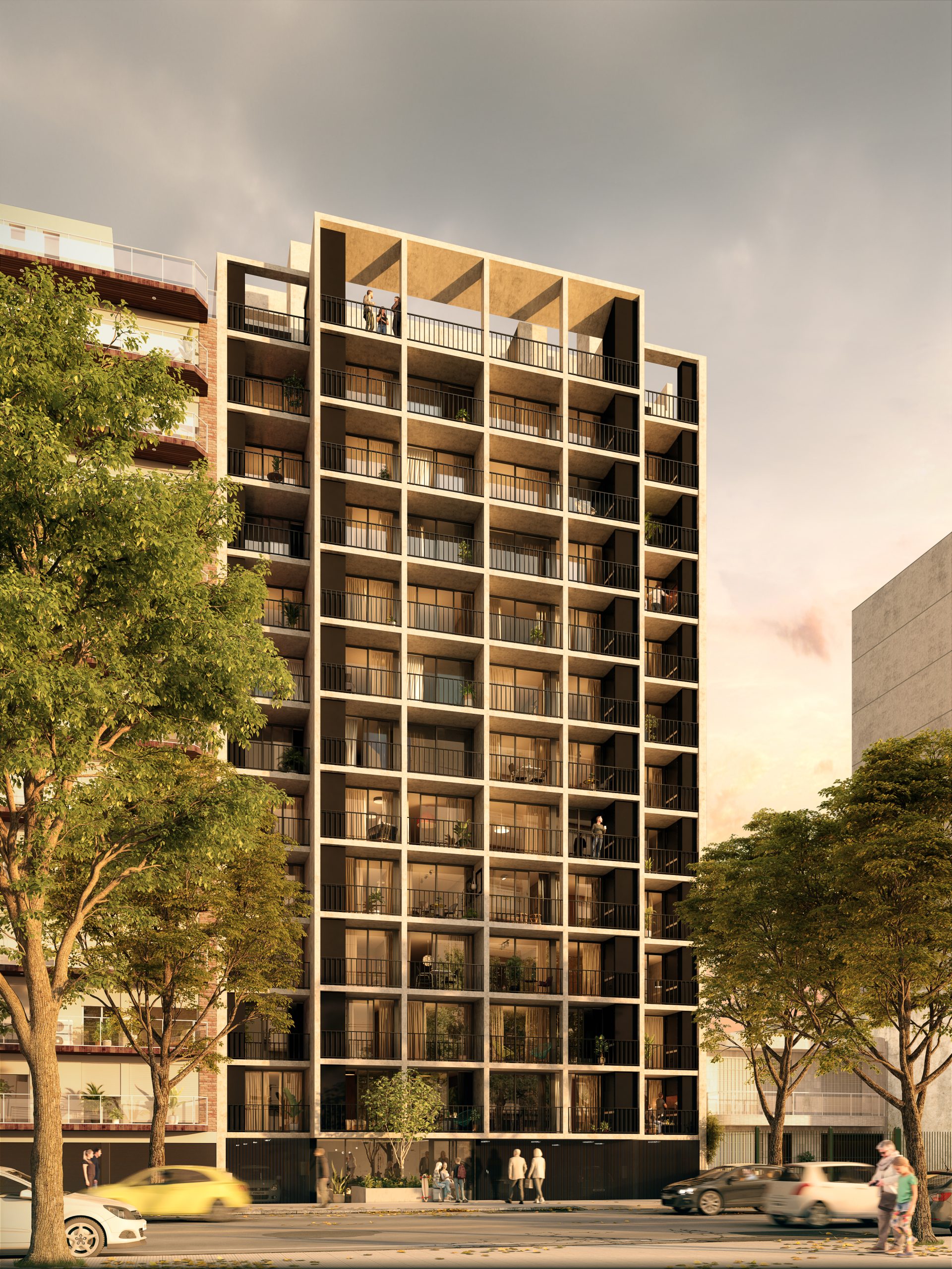 Como propuesta de partida se busca diseñar una planta con unidades amplias en metraje  priorizando el espacio exterior de terraza con parrillero como un plus adicional. Se concibió con un diseño de planta sencillo donde se estudió detalladamente el funcionamiento interno de las unidades al servicio del usuario. En fachada se propone jugar con una trama a modo de red que conforma un volumen uniforme para los volados.