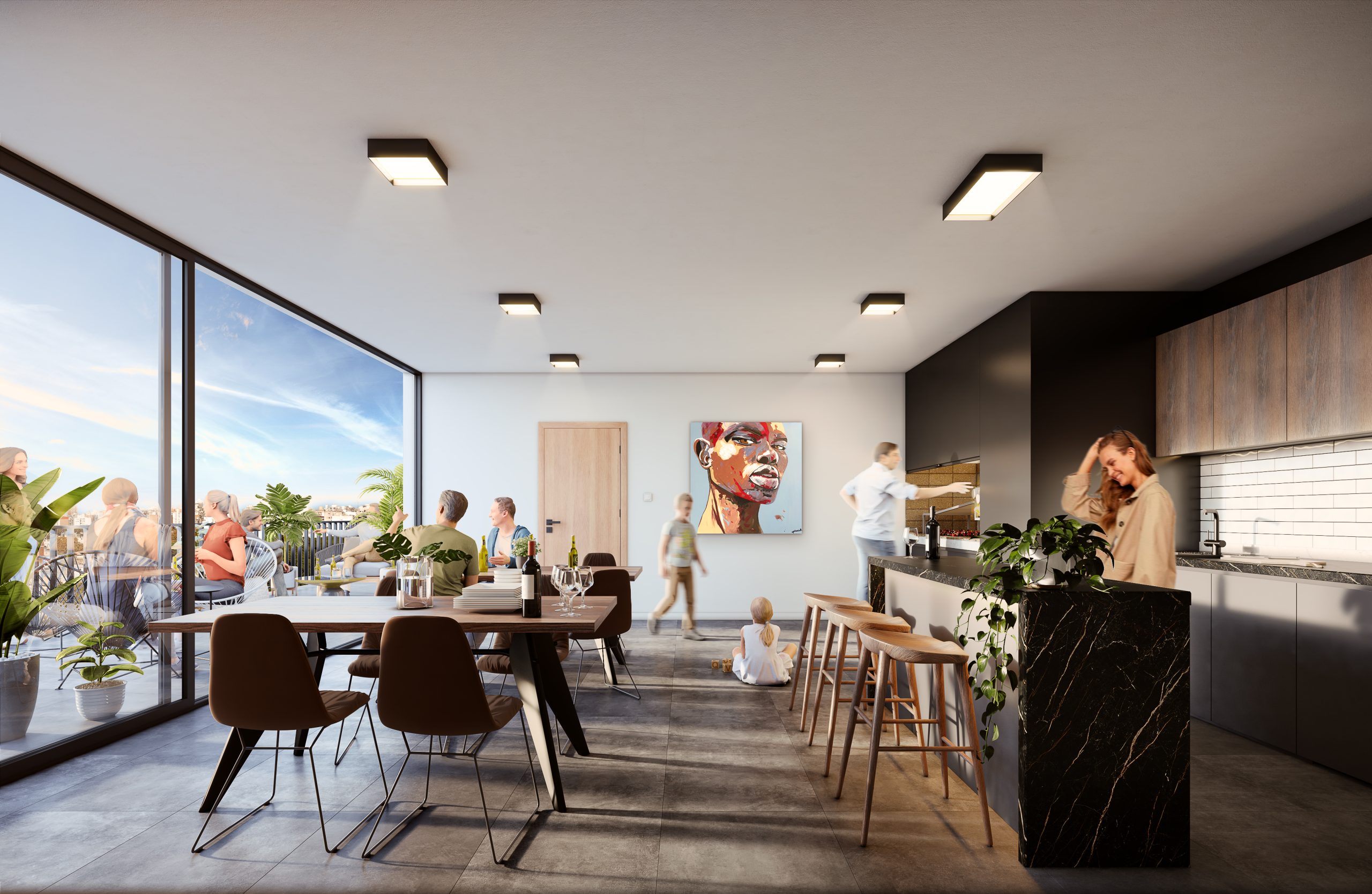 El edificio cuenta con doce niveles habitables. Se diseñaron espacios de amenities en piso 13 donde se encuentran la barbacoa cerrada con parrillero, gimnasio y el lavadero todos conectados por una terraza solárium en piso 13.